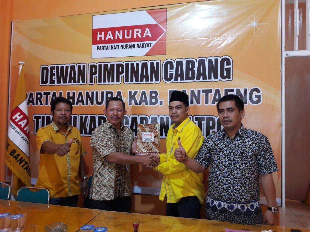 INFOSULSEL.com,BANTAENG — Bakal Calon Bupati Bantaeng Jabal Nur mengembalikan formulir pendaftaran Partai Hanur Bantaeng di Jalan Andi Mannappiang, Bantaeng, Kamis (27/07/2017). Pengembalian formulir pendaftaran itu langsung diterima oleh tim pilkada partai Hanura Bantaeng.