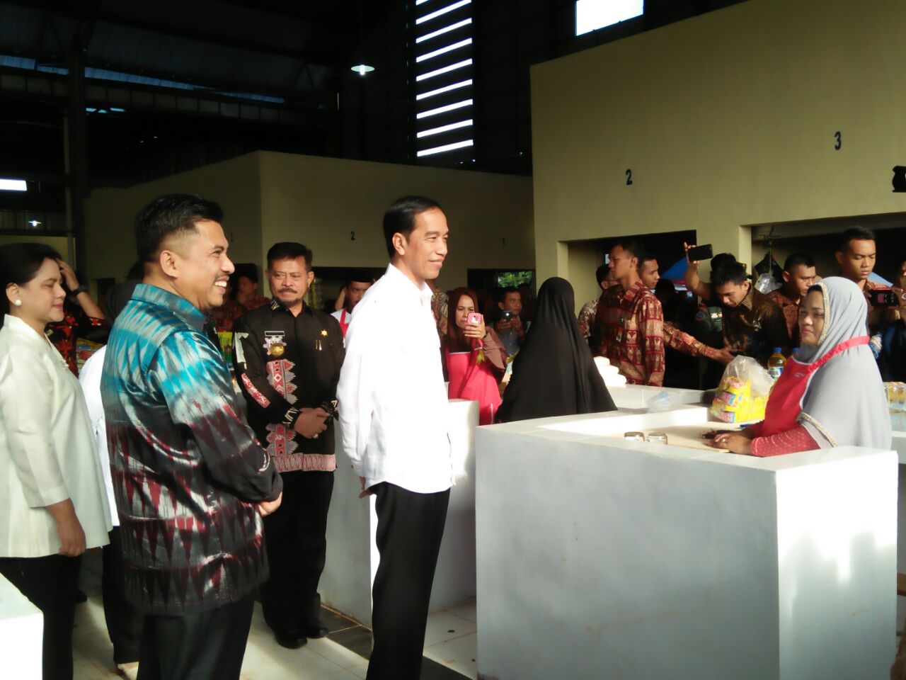Saat Jokowi bersama rombongan tiba di lokasi sekitar pukul 07.55 wita yang mengenakan baju kemeja putih dengan celana hitam , orang nomor satu di Indonesia itu berpesan kepada sejumlah pedagang agar tetap menjaga aset yang dibangun oleh pemerintah daerah itu.