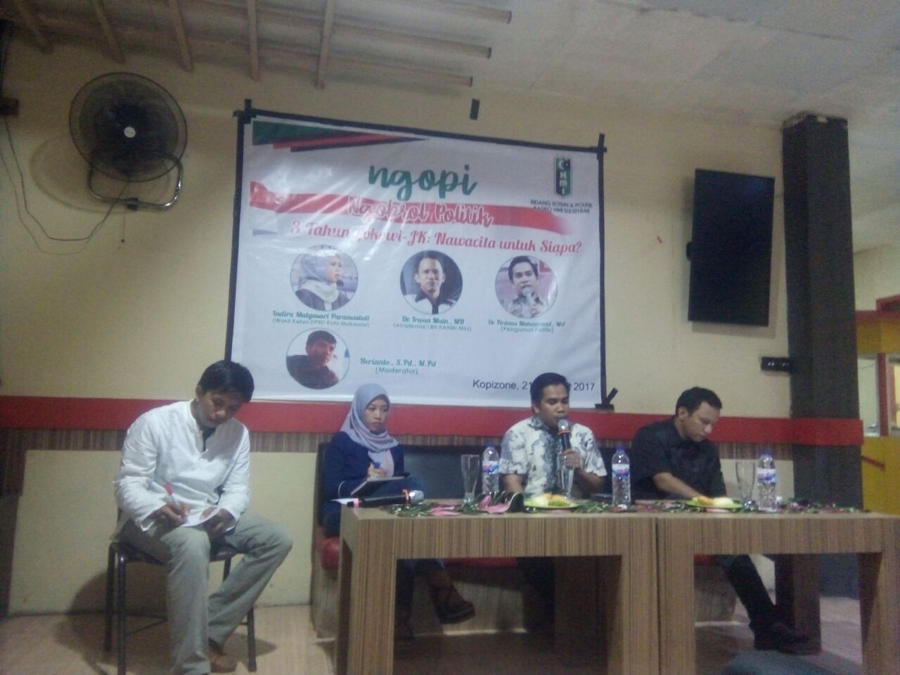 INFOSULSEL.COM, MAKASSAR– Pengurus Badko HMI Sulsel menggelar ngobrol politik dengan tema Tiga Tahun Jokowi-JK=Nawacita Untuk Siapa?. Acara tersebut di gelar di sebuah warkop di Jalan Boulevard Makassar,Sabtu (21/10/2017).