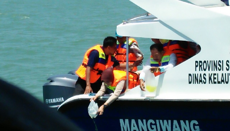 INFOSULSEL.COM, MAKASSAR—Gubernur Syahrul Yasin Limpo bersama sejumlah pejabat di lingkup Pemerintah Provinsi (Pemprov) Sulsel beserta tim G1000 Pengawas dan pemulihan sumber daya ikan, menebar 2 juta bibit ikan di Pelabuhan Perikanan Untia, Kamis (12/10/2017).