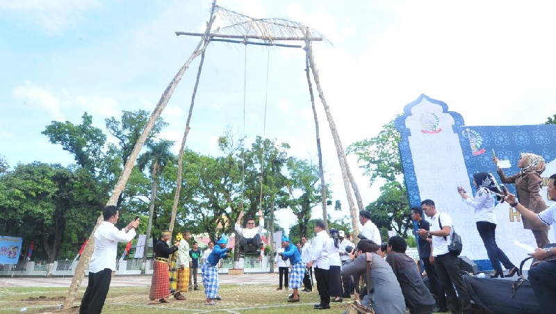 SYL ikut bermain bersama ratusan siswa yang mencoba permainan rakyat mattojang di Lapangan Upacara di Rumah Jabatan Gubernur Sulsel Rabu pagi(18/10).