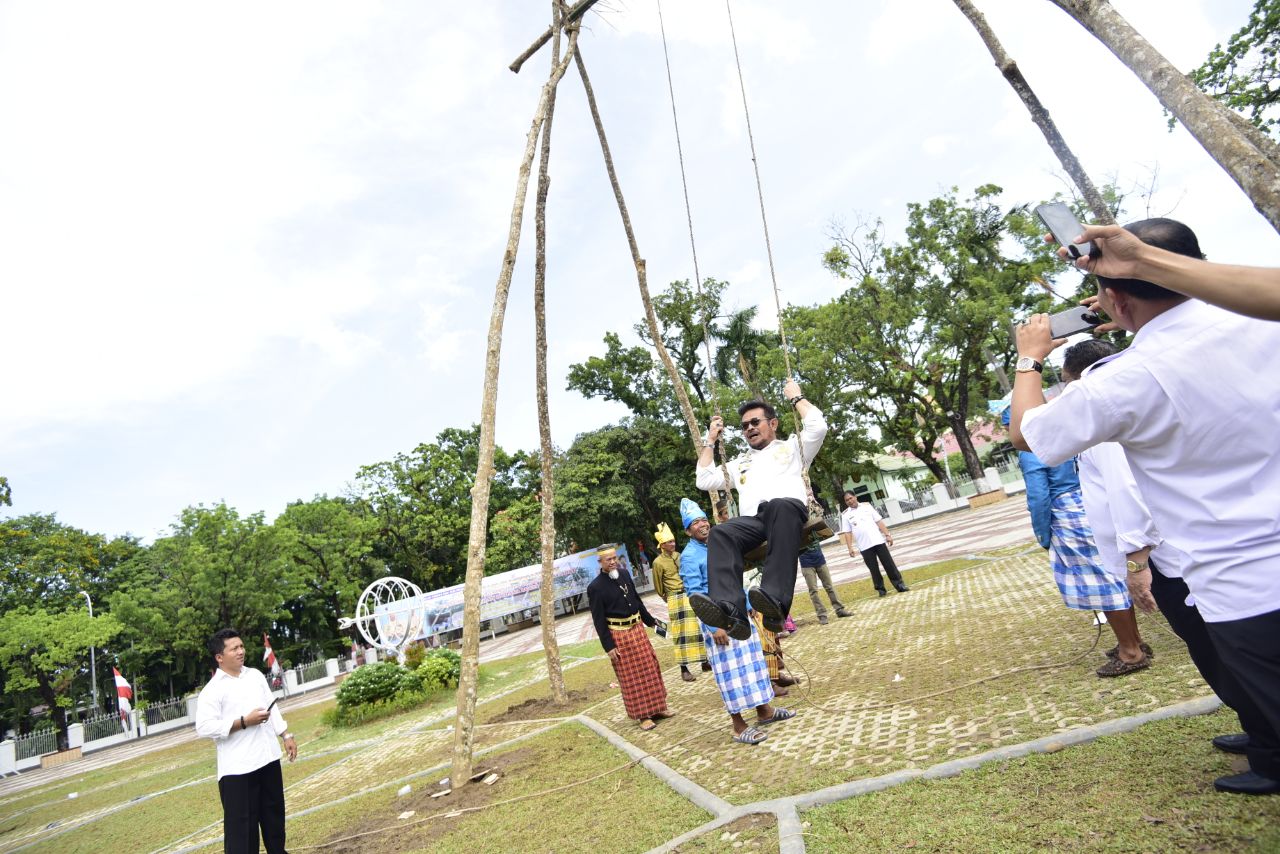 INFOSULSEL.COM, MAKASSAR–Gubernur Sulawesi Selatan Syahrul Yasin Limpo terlihat begitu sangat bahagia bersenang-senang di atas tojang (ayunan) raksasa yang memiliki tinggi 15 batang ayunan meter.