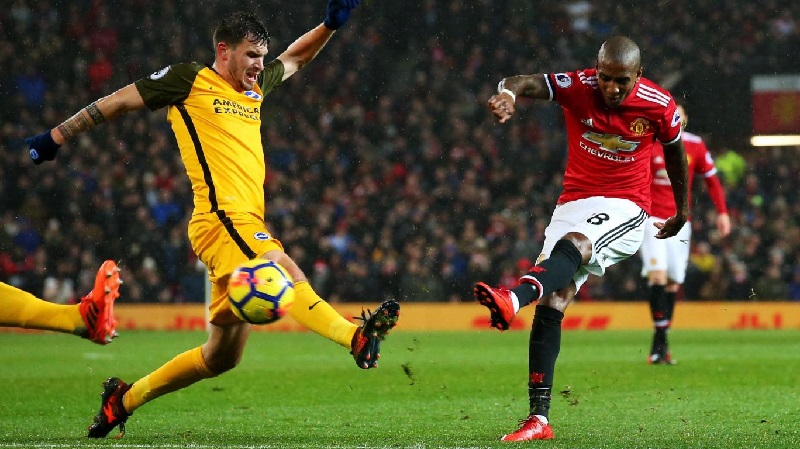 Tendangan dari Ashley Young yang membentur Lewis Dunk membuat Matt Ryan mati langkah. United pun unggul 1-0.