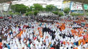INFOSULSEL.COM, MAKASSAR – Ribuan jamaah memadati tribun upacara Lapangan Karebosi dalam kegiatan zikir dan doa bersama, Jumat (5/1/2018) sore.