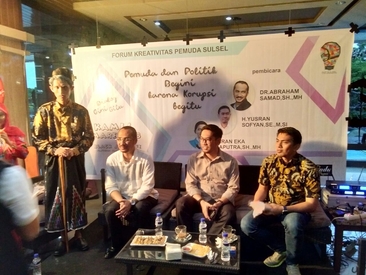 INFOSULSEL.COM, MAKASSAR— Wakil Ketua Dewan Perwakilan Rakyat Daerah Provinsi Sulawesi Selatan (DPRD Provinsi Sulsel), Yusran Sofyan, menjadi pembicara dalam Dialog Gini Gitu yang diadakan oleh Forum Kreativitas Pemuda (FKP) Sulsel di Black Sea Cafe, Jl. Sultan Alauddin Makassar, Kamis (1/3/2018).