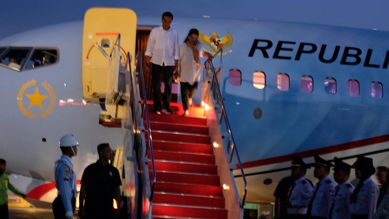 Kepala Negara didampingi sejumlah Menteri kabinet kerja telah tiba di Galatika Lanud Hasanuddin pukul 18.00 WITA. Mantan Gubernur DKI Jakarta tersebut selanjutnya menuju hotel.