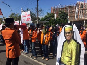 Dengan membawa poster besar bergambar Rektor UNM, Prof. Dr. Husain Syam, M.Tp, mereka menolak UNM yang ingin mengubah statusnya dari Satuan Kerja (Satker) menjadi Badan Layanan Umun (BLU).