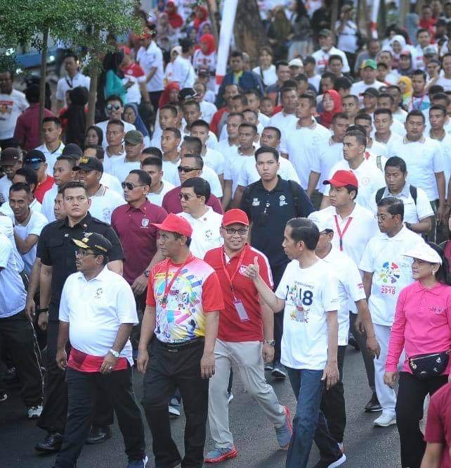 Jokowi yang hadir bersama Ibu Negara Iriana mengenakan kaus bertema Asian Games 2018. Keduanya sempat berjalan bersama peserta.Terlihat sejumlah tokoh mendampingi, yakni Menteri Pertanian Amran Sulaiman, Mensos Idrus Marham, Kepala Staf Presiden Moeldoko, Pj Gubernur Sulsel Sumarsono, Gubernur Jawa Tengah Ganjar Pranowo dan Wali Kota Makassar Mohammad Ramdhan Pomanto.