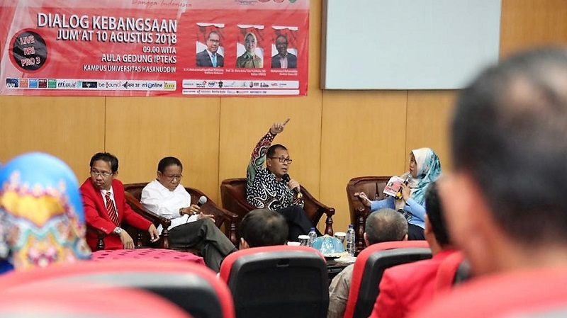INFOSULSEL.COM, MAKASSAR, — Wali Kota Makassar, Moh. Ramdhan Pomanto menjadi narasumber pada dialog kebangsaan yang diadakan RRI Makassar, Jumat (10/8/2018) di Gedung Ipteks Universitas Hasanuddin (Unhas).