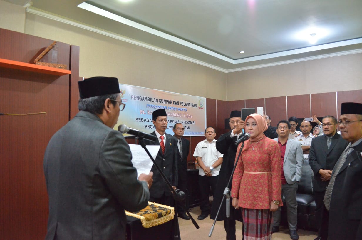 INFOSULSEL.COM, MAKASSAR — Kepala Dinas Komunikasi, Informatika, Statistik dan Persandian (Kominfo SP) Sulsel, Andi Hasdullah melantik dan mengambil sumpah komisioner Komisi Informasi (KI) Pengganti Antar Waktu (PAW), St Rabiah Tanrere, S.Sos, di Ruang Kerjanya, pada Rabu (5/9/2018).