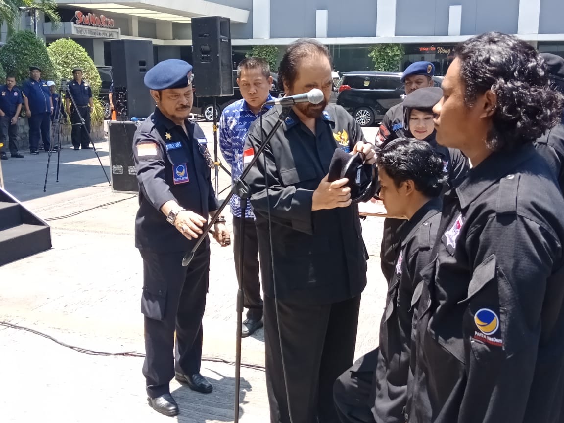 INFOSULSEL.COM, MAKASSAR–Ketua Umum DPP Partai NasDem Surya Paloh mengukuhkan anggota Komando Strategi Nasional (Kostranas) Garda Pemuda NasDem Sulsel. Pengukuhan ditandai dengan penyematan Baret kepada tiga perwakilan KostraNas, di halaman Hotel Claro, Makassar, pada Kamis (27/9/2018)