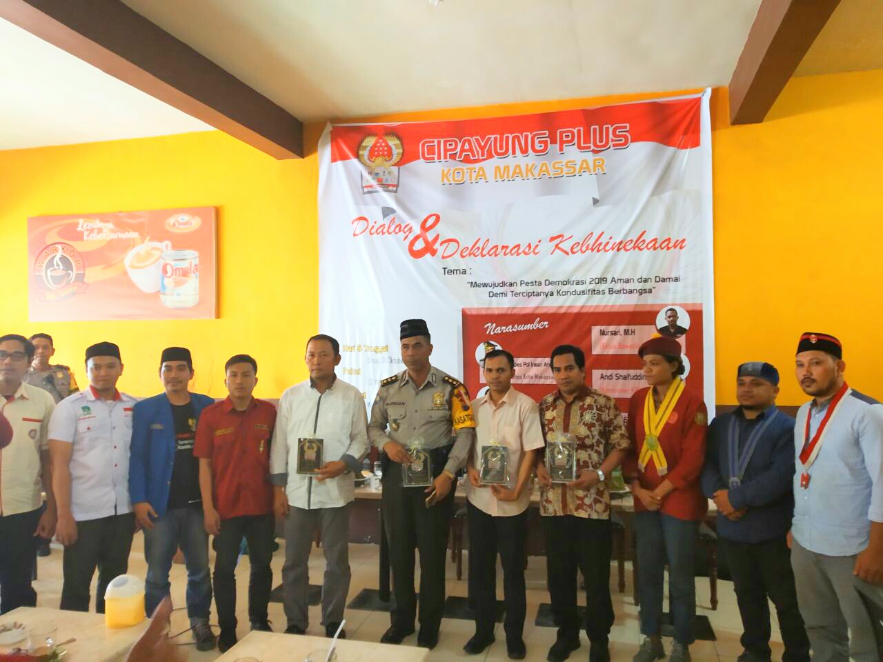 INFOSULSEL.COM, MAKASSAR— Lembaga mahasiswa Cipayung Plus Kota Makassar menggelar dialog dan deklarasi kebhinekaan dengan “Mewujudkan Pesta Demokrasi Pemilu 2019 Yang Aman dan Damai Demi Terciptanya Kondusifitas Berbangsa” di Warkop Dg Anas, Jl Faisal Raya, pada Senin (1/10/2018).