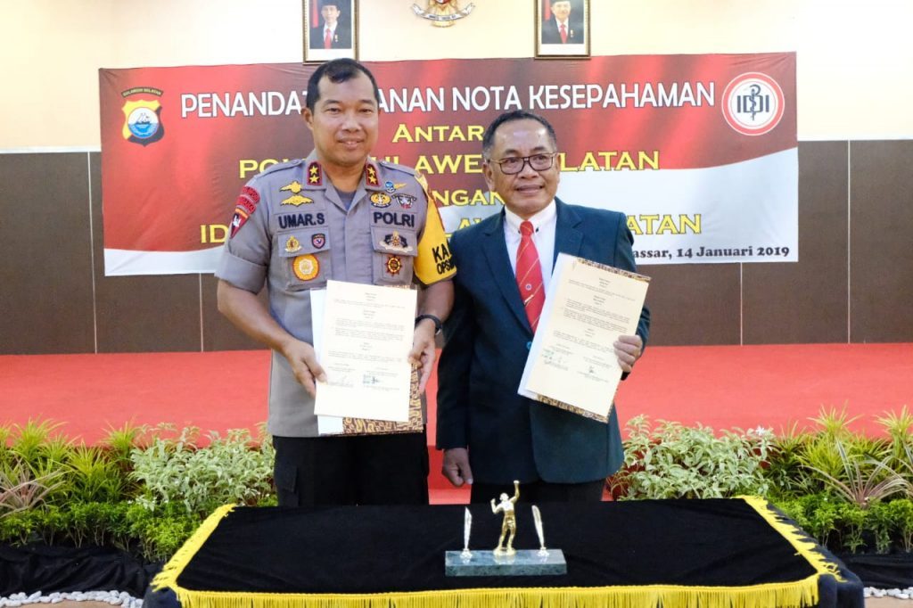 INFOSULSEL.COM, MAKASSAR – Bertempat di Aula Rumah Sakit (RS) Bhayangkara, Kepala Kepolisian Daerah Sulawesi Selatan (Kapolda Sulsel) Irjen Pol Drs. Umar Septono bersama Ketua Ikatan Dokter Indonesia (IDI) Sulsel, dr. Muhammad Ichsan Mustari melakukan Penandantanganan Nota Kesepahaman, Senin (14/1/2019).