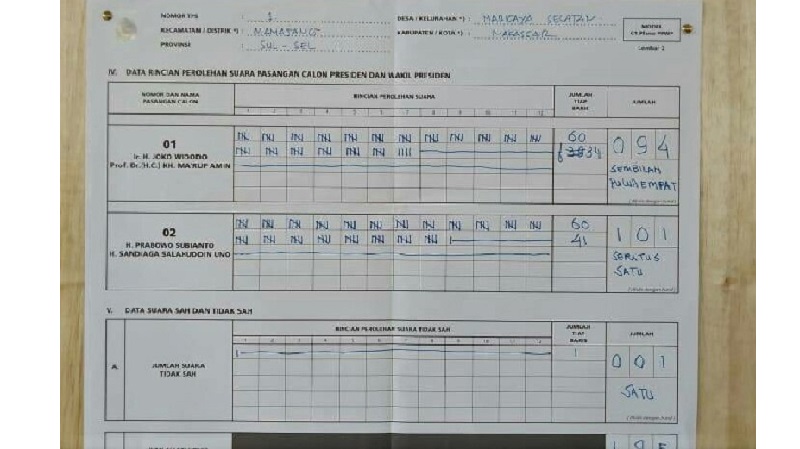 Dari hasil perhitungan suara di TPS tersebut pasangan nomor urut 02 unggul dengan perolehan 101 suara. Sementara pasangan nomor urut 01 meraih 94 suara.