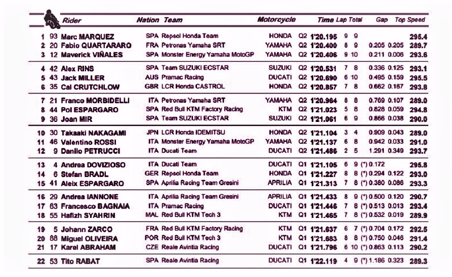 Melengkapi posisi lima besar ada Alex Rins dan Jack Miller. Rins mencatat waktu 0,336 detik lebih lambat dari Marquez. Sementara itu Miller 0,495 lebih detik dari Baby Allien.