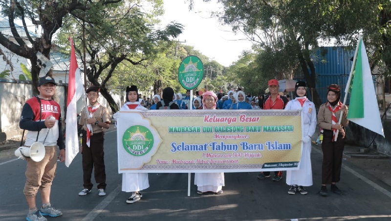 INFOSULSEL.COM, MAKASSAR – Madrasah DDI Galesong Baru Makassar, Sulawesi Selatan memeriahkan tahun baru Islam 1440 Hijriah dengan karnaval, Ahad (1/9/2019). Ratusan siswa dari tingkat Ibtidaiyah, Tsanawiyah dan Aliyah, berjalan mengelilingi wilayah utara kota Makassar dengan mengenakan busana muslim dan pakaian adat.