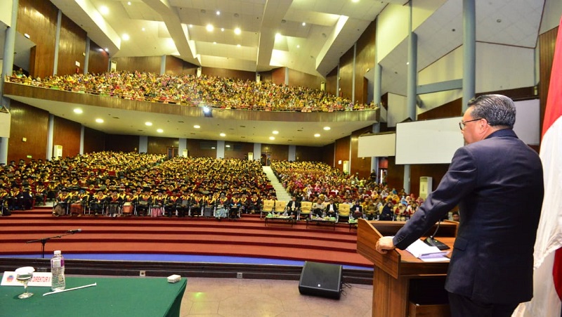 Di depan 1000-an sarjana baru ini Gubernur Sulawesi Selatan, Nurdin Abdullah berpesan setelah terjun ke masyarakat agar dapat mengimplemtasikan ilmu yang didapat secara profesional.