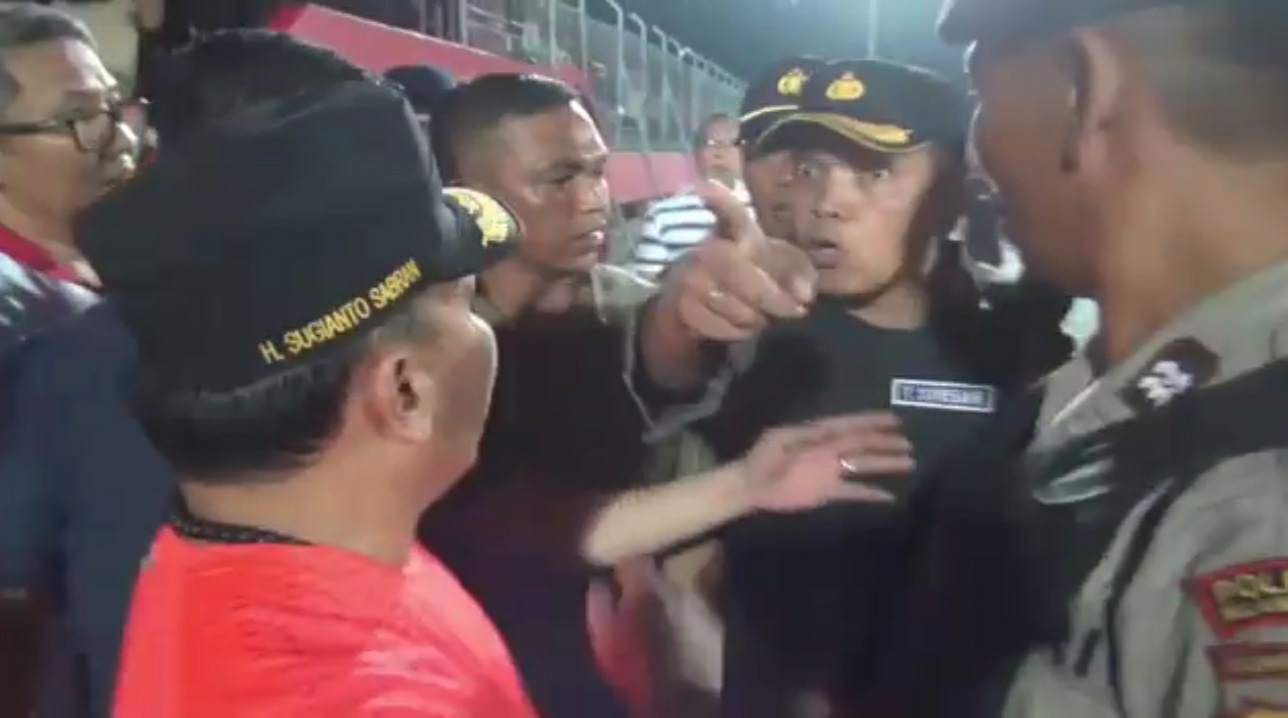 Sugianto terlihat sangat emosional. Ia juga sesekali menunjuk-nunjuk ke arah stadion.