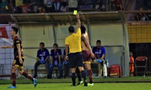 FERDINAND Sinaga dihadiahi kartu kuning oleh wasit Faulur Rosy usai mencetak gol terakhir saat PSM pesta gol ke gawang Persipura Jayapura, Senin (18/11/2019) malam di Stadion Mattoangin.