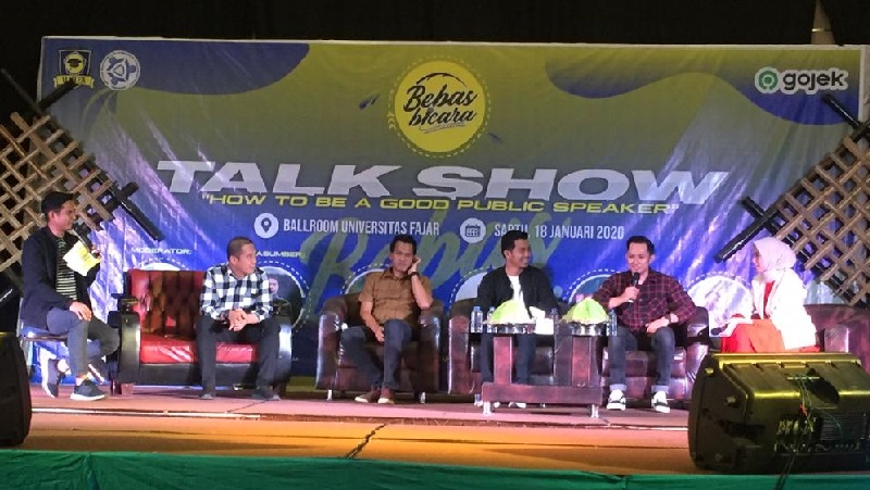 INFOSULSEL.COM, MAKASSAR – Mahasiswa Jurusan Ilmu Kominikasi Fakultas Ekonomi dan Ilmu Sosial Universitas Fajar (Unifa) menggelar Talk Show dengan tema “How to Be a Public Speaker”, Sabtu (18/1/2020).