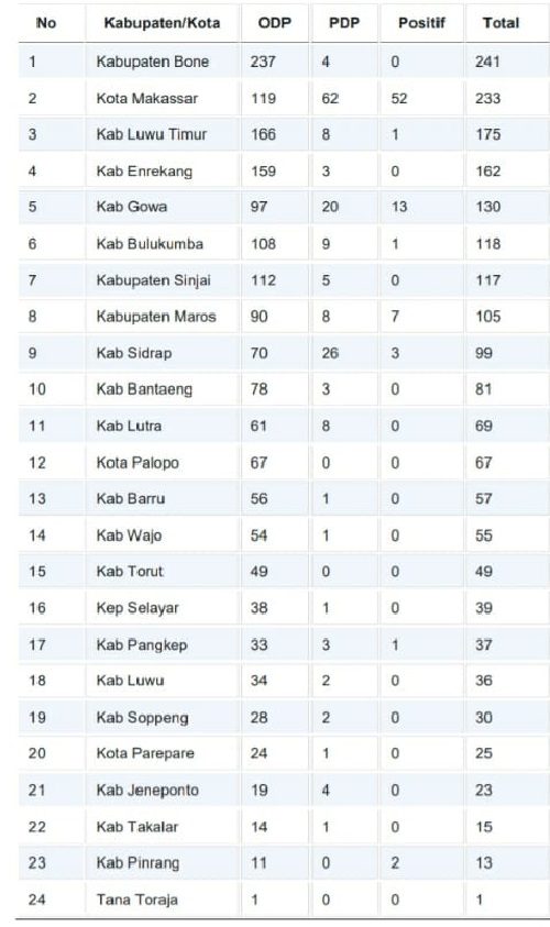 Dari 24 kabupaten/kota di Sulsel, Makassar masih berada di peringkat terbanyak dengan 52 kasus disusul kabupaten Gowa 13 kasus kemudian Kabupaten Maros 7 kasus dan Sidrap dengan 3 kasus dan Pinrang 2 kasus. Tiga daerah lainnya tetap dengan 1 kasus yakni Luwu Timur, Bulukumba, dan Pangkep.