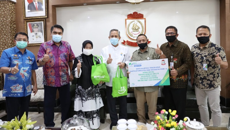 Selain menyerahkan bantuan sembako, juga diserahkan santunan bagi pengguna BPJAMSOSTEK, berupa santunan kematian, santunan kecelakaan kerja, jaminan hari tua, serta jaminan pensiun.