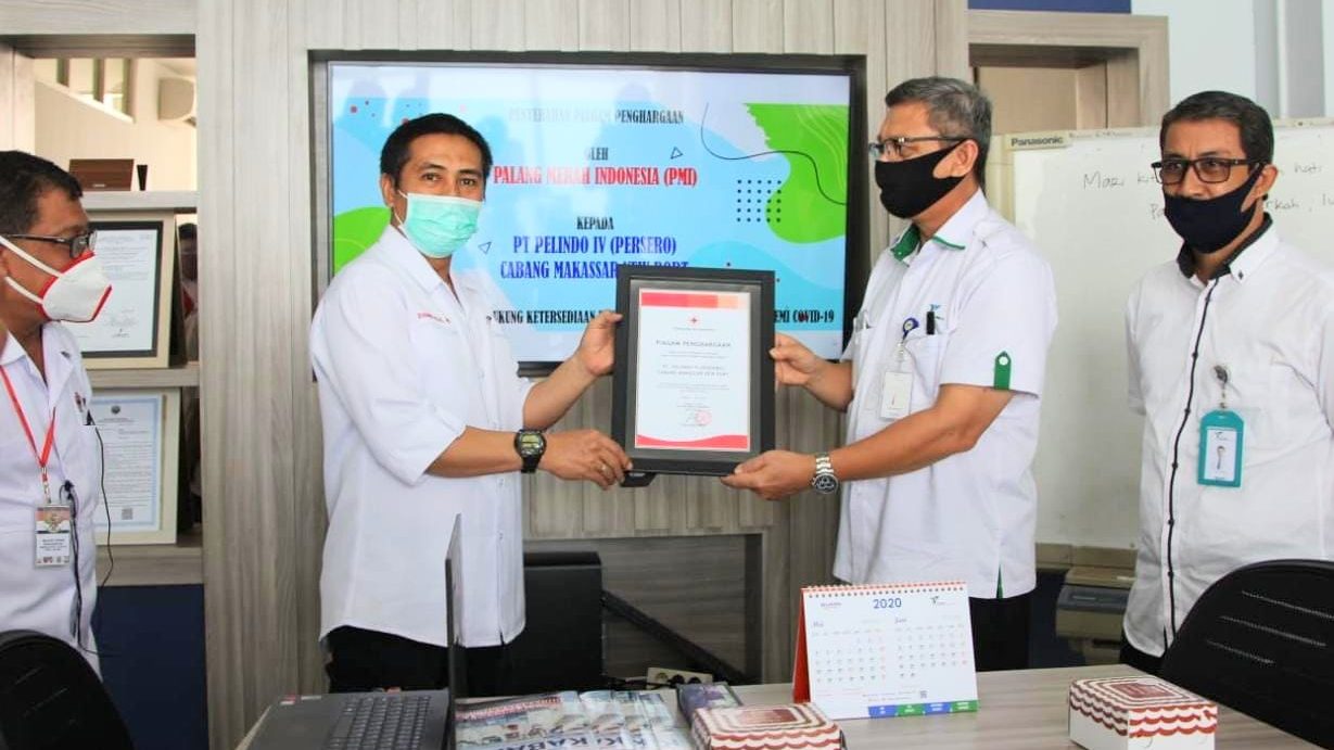 INFOSULSEL.COM, MAKASSAR – PMI Makassar menyerahkan piagam penghargaan kepada PT. Pelindo IV (persero) cabang Makassar New Port (MNP) di Jl. Sultan Abdullah Raya, Kamis (9/7/2020).