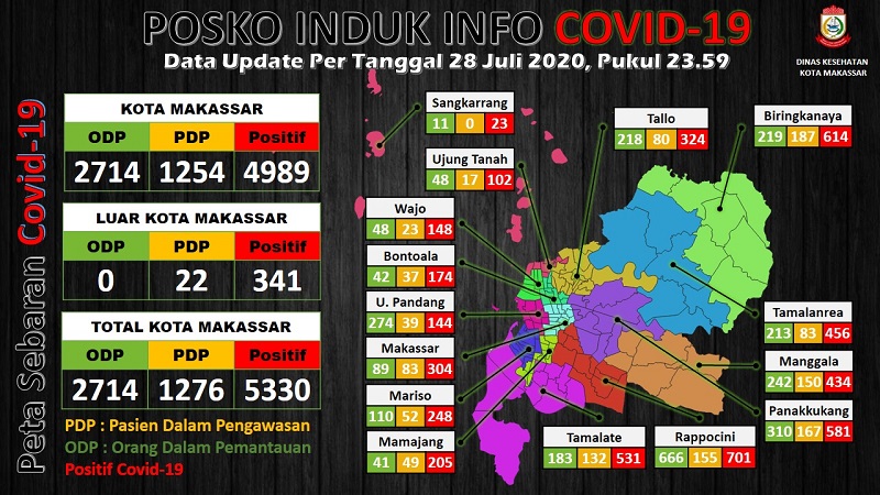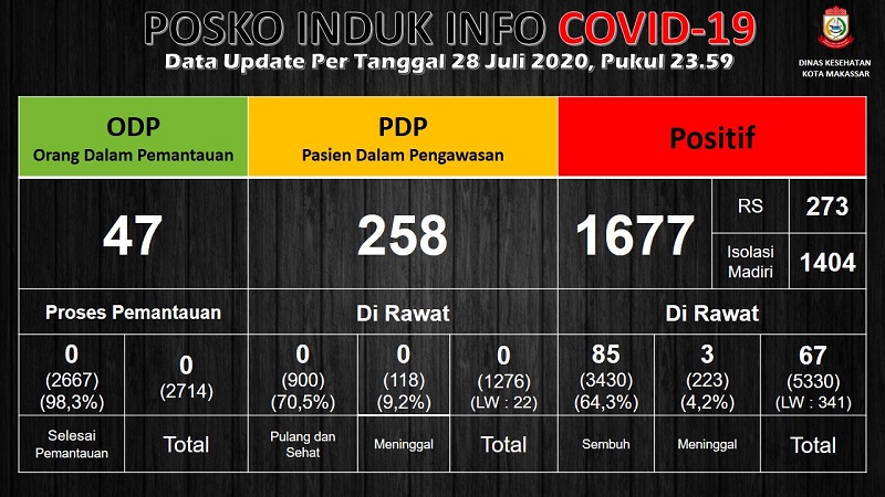 INFOSULSEL.COM, MAKASSAR — Jumlah pasien positif virus corona di Kota Makassar, Sulawesi Selatan mengalami peningkatan. Berikut data covid-19 di Kota Makassar pertanggal 29 Juli 2020.(andi)