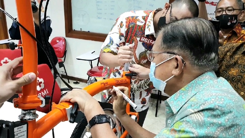 Sepeda ini menjadi bukan sembarang Brompton. Sebab di body sepeda lipat itu ada tanda tangan Ketua Umum PMI Jusuf Kalla dan Sandiaga Uno.