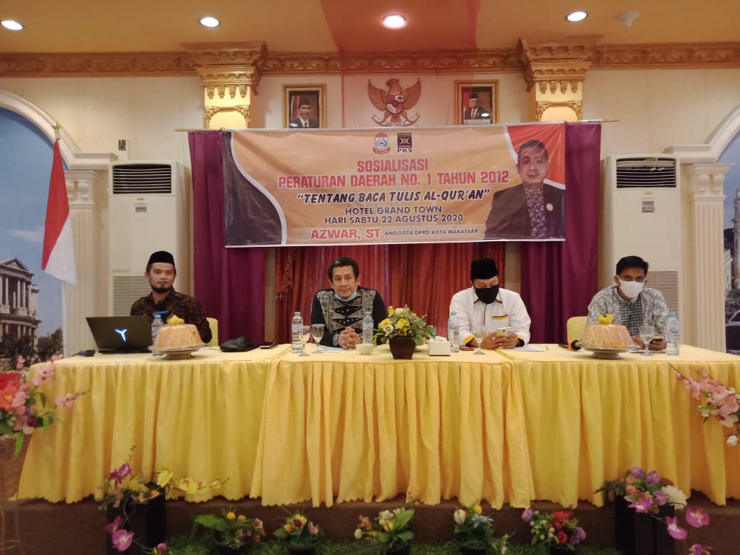 INFOSULSEL.COM ,MAKASSAR – Anggota DPRD Makassar Azwar menggelar Sosialisasi Peraturan Daerah (Perda) nomor 1 tahun 2012 tentang Baca Tulis Al Qur’an di Hotel Grand Town, Sabtu (22/8/2020).