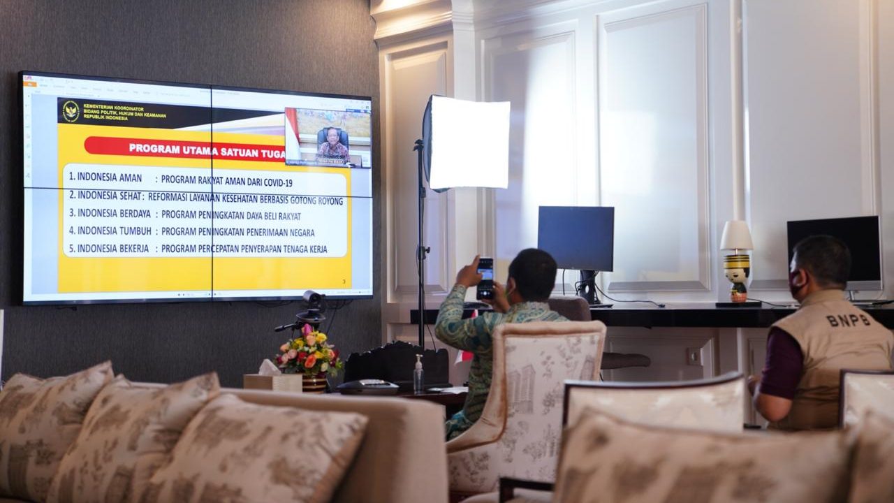 Kepada peserta rapat, Menteri Polhukam kemudian menyampaikan lima program utama satuan tugas. “Indonesia Aman, Indonesia Sehat, Indonesia Berdaya, Indonesia Tumbuh, dan Indonesia Bekerja,” sebutnya.