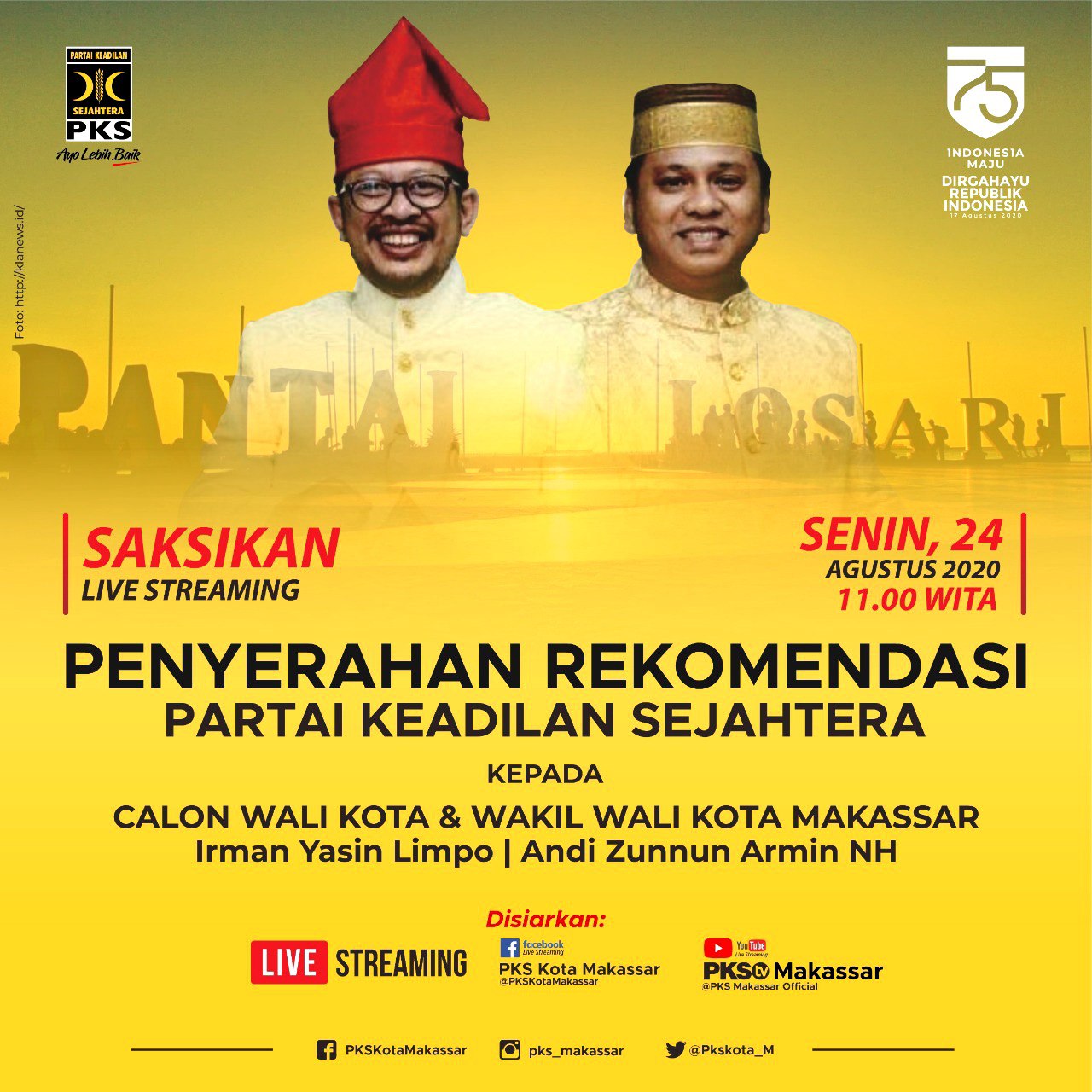 INFOSULSEL.COM, MAKASSAR – Pasangan bakal calon walikota dan wakil walikota Makassar Irman Yasin Limpo– Zunnun dijadwalkan akan menerima secara resmi surat dukungan Partai Keadilan Sejahtera (PKS) pada hari ini, Senin (24/8/2020) siang di kantor DPW PKS Sulsel.