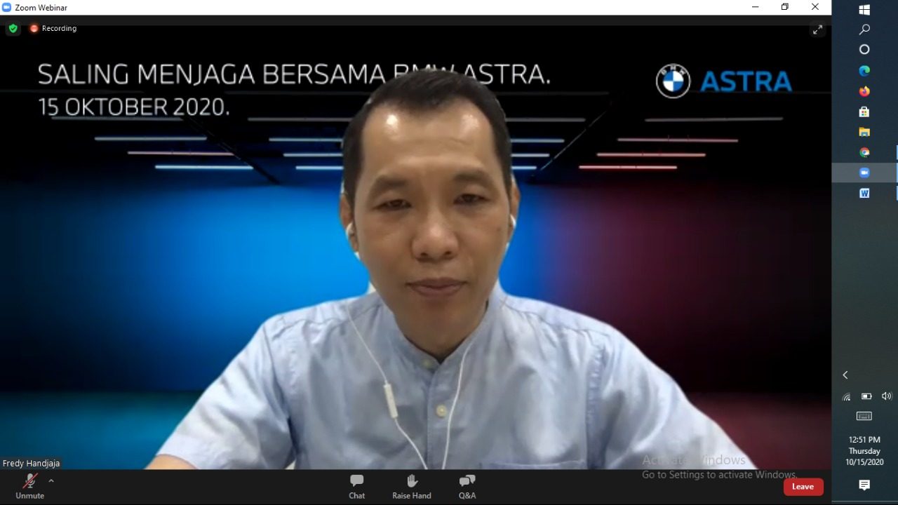 “ BMW Astra saat ini memberikan fasilitas QR Qode Chek-In untuk menggantikan Finger kehadiran karyawan, tentu untuk menjaga dan mengupayakan kesehatan dan kenyamanan karyawan,” papar Fredy melalui Zoom, Kamis, (15/10/2020).
