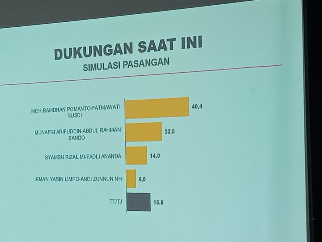 Dengan presentase diatas 40 persen. Hasil survei tersebut cukup jauh dari 3 saingan beratnya, yakni Munafri Arifuddin-Abdul Rahman Bando (Appi-Rahman), Syamsu Rizal MI-Fadli Ananda (DILAN), dan Irman Yasin Limpo-Andi Zunnun Armin NH (IMUN).