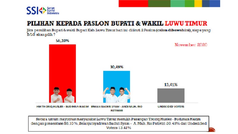 INFOSULSEL.COM, LUWU TIMUR —– Lembaga Survei Script Survey Indonesia (SSI) merilis hasil survei terbaru Pilkada 2020 Kabupaten Luwu Timur, Sulawesi Selatan (Sulsel). Pasangan Thoriq Husler – Budiman belum terkalahkan. Surveynya mencapai 56.10 persen.