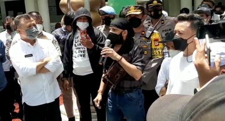 INFOSULSEL.COM, MAKASSAR – Ratusan pekerja tempat hiburan malam (THM) berunjuk rasa di depan Balai Kota Makassar, jalan Ahmad Yani, Rabu (10/2/2021). Massa menuntut Pj Wali Kota mencabut surat edaran tentang pembatasan jam malam.
