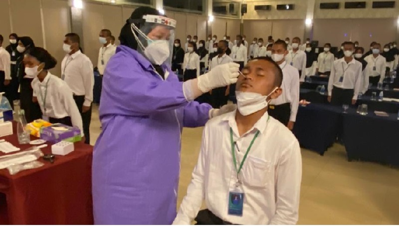 INFOSULSEL.COM, MAKASSAR –Sebanyak 70 anggota Pasukan Pengibar Bendera Pusaka (Paskibraka) Makassar menjalani tes swab antigen oleh tim medis, di Hotel Horison, Makassar, Senin malam (16/8/2021).