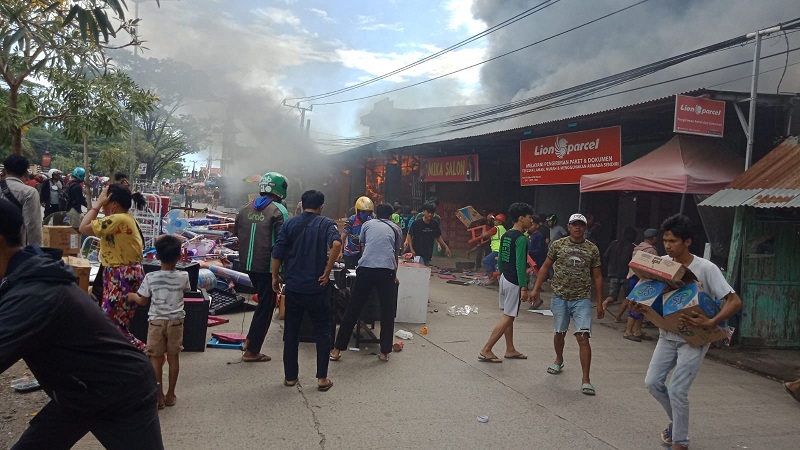 Informasi yang diterima di lokasi kejadian, api berasal dari salah satu rumah di belakang deretan kios. Angin yang bertiup kencang membuat si jago merah cepat membesar. Asap hitam yang membumbung tinggi membuat masyarakat di sekitar kejadian panik. Tidak ada korban jiwa pada kebakaran yang terjadi pada siang hari ini.