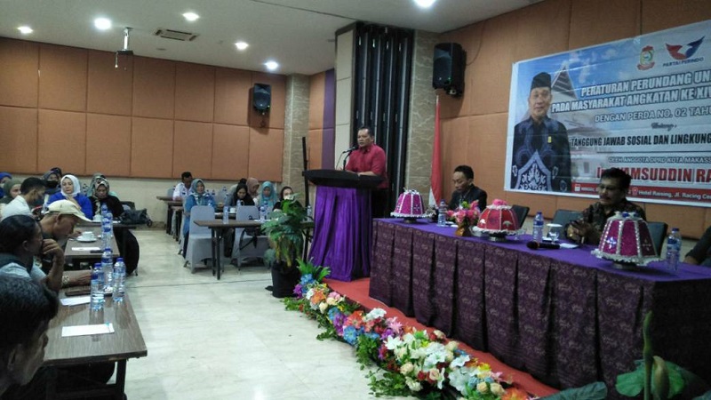 INFOSULSEL.COM, MAKASSAR— Anggota DPRD Kota Makassar Syamsuddin Raga menggelar sosialisasi penyebaran produk hukum daerah “Perda Nomor 2 Tahun 2016 Tentang Tanggung Jawab Sosial dan Linkungan Perusahaan”, di Hotel Raising Star, Jl. Racing Center, Minggu (4/9/2022).