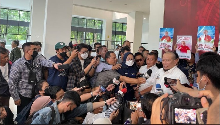 INFOSULSEL.COM, JAKARTA — Penyerahan berkas pendaftaran La Nyalla Mahmud Mattalitti sebagai bakal calon Ketua Umum PSSI periode 2023 – 2027 diwarnai oleh seruan poster dukungan di kantor PSSI, GBK, Senayan, Jumat (13/1/2023).
