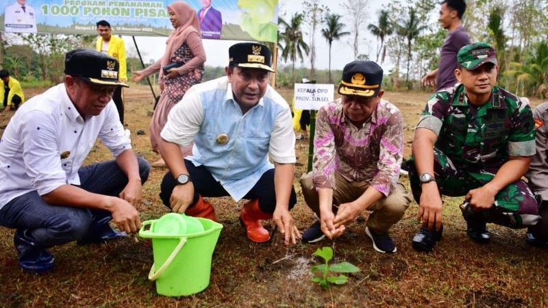 INFOSULSEL.COM, MAKASSAR | Penjabat Gubernur Sulsel, Bahtiar Baharuddin bersama Rektor Institut Agama Islam Negeri (IAIN) Bone, Prof Syahabuddin secara simbolis melakukan penanaman perdana bibit pisang cavendis.