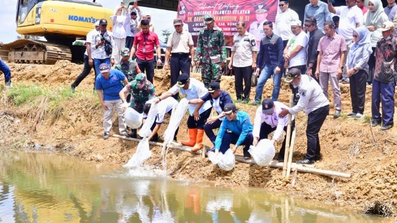 Kegiatan ini dalam rangka meningkatkan ketahanan pangan. Pj Gubernur Sulsel bersama Kepala Dinas Kelautan dan Perikanan Sulsel, Muhammad Ilyas, dan Pj Bupati Bone, Andi Islamuddin.