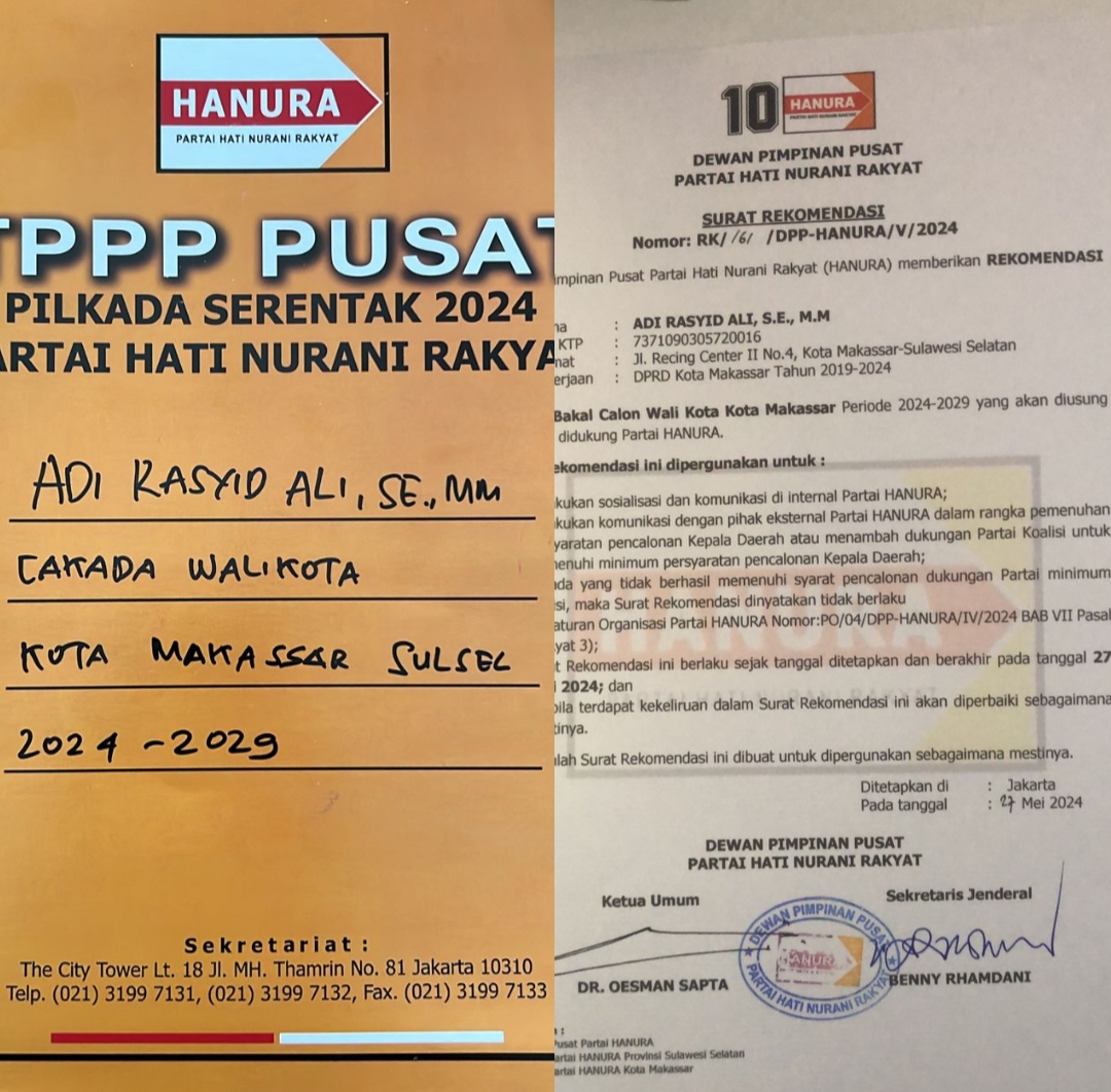 INFOSULSEL.COM, MAKASSAR | Langkah Adi Rasyid Ali menuju Pemilihan Walikota dan Wakil Walikota (Pilwali) Makassar November 2024, semakin mantap. Itu usai mengantongi rekomendasi dari DPP Partai Hati Nurani Rakyat (Hanura).